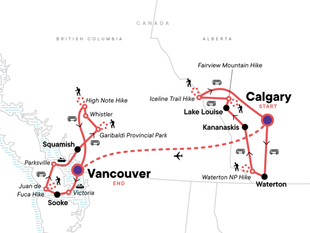 Your Welcome Moment: Welcome Meeting - Meet Your CEO and Group. Trip to Waterton National Park. Hike along Bertha Lake trail. Visit to Red Rock Canyon. Hike the Crypt Lake or Carthew Summit trails. Hike the Ptarmigan Cirque trail. Burstall Pass trail. Banff National Park visit. Climb up Fairview Mountain. Rafting trip down the Bow River. Walk the Iceline trail in Yoho National Park. Flight from Calgary to Vancouver. Ferry ride from Vancouver to Sooke. Hiking in East Sooke Provincial Park. A trek along a portion of the Juan de Fuca trail. Cowichan Lake visit. Ferry from Nanaimo to Horseshoe Bay. A hike up The Stawamus Chief train. A visit to Garibaldi Provincial Park and a hike to the Elfin Lakes. A ride up the Whistler Gondola to hike the High Note trail. All transportation between destinations.