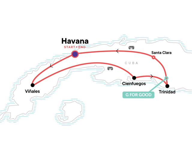 Your Local Living Moment: Havana Homestay, Havana. Arrival transfer. Walking tour of Old Havana. Havana City tour in vintage automobiles. Revolution Square visit (Havana). Cigar tour in Pinar del Río with demonstrations. Viñales and Trinidad orientation walks. Giron Museum visit (Bay of Pigs). Visits and entry to the Che monument and historical sites in Santa Clara. Guided tour of Santa Clara. Free time in Havana and Viñales. Informal Spanish lesson. All transport between destinations and to/from included activities.