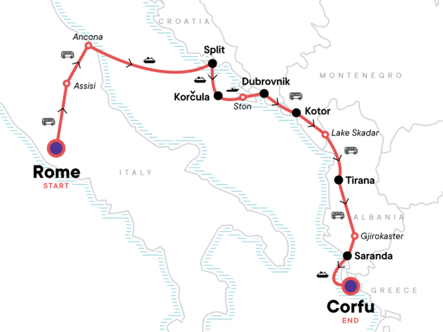 Your Welcome Moment: Welcome Moment - Meet Your CEO and Group. Set off on a guided night walk of the ancient streets in Rome. Visit the spectacular Kravica Waterfall. Experience the Deša Women's Centre in Dubrovnik. Explore Tirana on a half day guided tour. Enjoy a scenic drive along Kotor Bay. Walk to Kotor fortress at sunrise. See Skadar Lake. Enjoy free time in major cities along the way. All transportation between destinations.