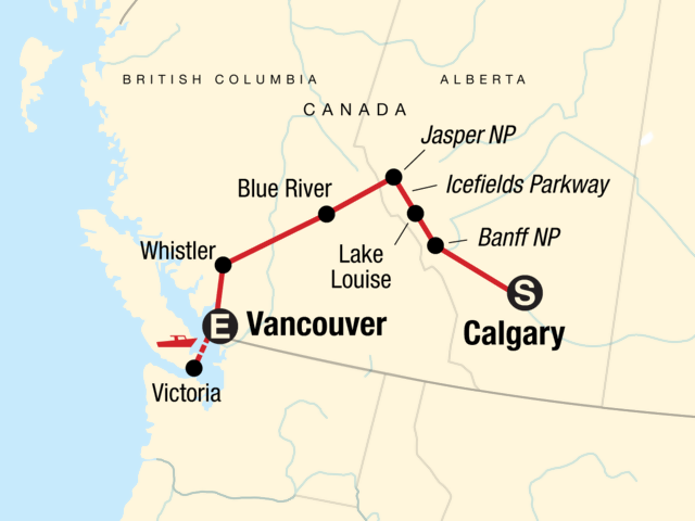 Your Wellness Moment: Miette Hot Springs Visit, Jasper National Park. All park fees in Jasper and Banff National Parks. Scenic ferry to Vancouver Island. Vancouver, Calgary, Victoria, Whistler, and Banff orientation walks. River float tour. Stops at Kamloops Lake and Seton Lake. Mount Robson Visitor Centre stop. Excursion to the Columbia Icefields and ice walk on the Athabasca Glacier. All transport between destinations and to/from included activities.