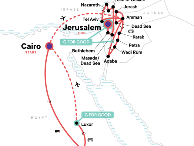 Your Local Living Moment: Druze Village Visit and Traditional Lunch , Isfiya Druze Village. Pyramids of Giza and Sphinx tour. Egyptian Museum guided tour. Felucca Sailing Excursion with support boat for toilet/showers. Kom Ombo and Karnak Temples visit. Colossi of Memnon Visit. Temple of Hatshepsut and Valley of the Kings visit. Funtasia Project visit.Tel Aviv Old Port of Jaffa tour. Akko, Nazareth and Bethlehem visits. Sea of Galilee tour. Guided tour of Masada. Jerusalem Old City walking tour. Jerash guided tour. Dead Sea visit. Madaba mosaics guided tour. Mt Nebo. Karak Castle guided tour. Petra guided tour. Wadi Rum jeep excursion. All entrance fees to included monuments. Internal flights. All transport between destinations and to/from included activities.