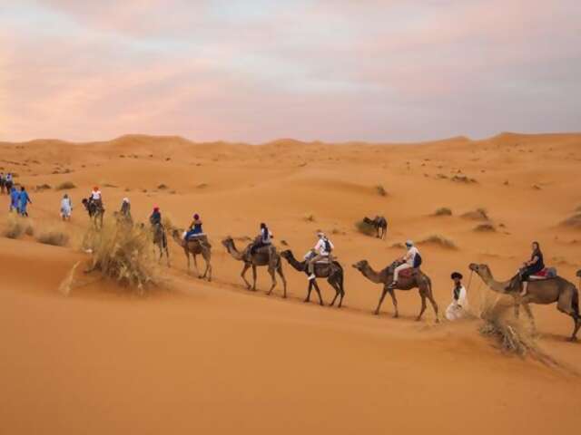 Journey into the vast, golden reaches of the desert. Mint tea and a warm welcome await you at your dune-side hotel. Saddle up and travel by camel to the perfect perch atop the dunes to view the sunset paint the sky hues of red, blue, and yellow. After, under a canopy of stars, enjoy dinner and an evening of entertainment by the campfire. Let your imagination run wild as you listen to traditional music on the drums alongside stories about the region. We dare you to top this campfire experience.
