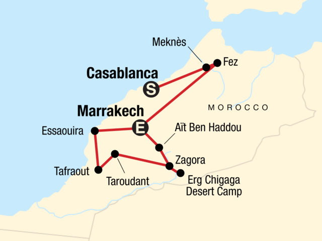 Your Foodie Moment: Djemaa el Fna Market Square Visit, Marrakech. Arrival transfer. Guided city tour of Meknès. Guided tour of Volubilis. Guided walking tour of the Fès medina including artisans' quarters and Fès tannery. Guided night walk of Djemaa el Fna square. Marrakech medina walk and spice shop visit. Marrakech tour including souks, Bahia Palace and Saadian Tombs. Visit the ancient kasbah of Aït Ben Haddou. Sahara excursion by 4x4 including a visit to the town of Tamegroute. Overnight in a comfortable, traditional desert camp with dinner under the stars and sunset desert walk. Explore the Draa region and orientation tour of Zagora. Taroudant market visit. Aït Mansour Gorge excursion. Visit to Tafraoute. Explore Essaouira. Visit Menara Gardens and the Jardin Majorelle. All transport between destinations and to/from included activities.