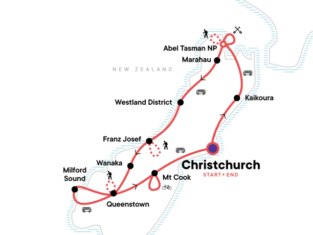 Your Discover Moment: Franz Josef. Abel Tasman National Park hike. Sea kayaking in Abel Tasman National Park. Punakaiki pancake rocks visit. Seal colony stop. Okarito Lagoon walk. Full-day Routeburn Track hiking excursion. Fiordland National Park visit. Cruise through Milford Sound. Mount Cook cycling excursion. Hike the Mt Cook region. Orientation walk in Christchurch. Free time in Franz Josef and Queenstown. All transport between destinations and to/from included activities.