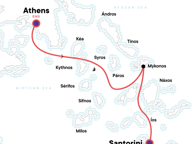 Possible island stops include: Folegandros, Sifnos, Ios, Antiparos, Paros, Naxos.