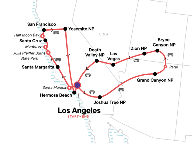 Your Welcome Moment: Welcome Moment - Meet Your CEO and Group. Hike in Julia Pfeiffer Burns State Park. San Francisco orientation tour. Yosemite National Park visit. Nevada and Vernal Fall hike. Tuolumne Grove of Giant Sequoias. Surf lesson. Visit to Joshua Tree National Park. Drive along Route 66. Hike in Grand Canyon National Park. Visit to Horseshoe Bend. Bryce Canyon National Park visit. Zion National Park visit. Free time in Las Vegas. Death Valley National Park visit. Entrance fees to all national parks and monuments with hiking and walking excursions. Self-inflating mattresses and dome tents. All transport between destinations and to/from included activities.