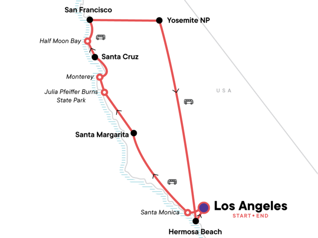 Drive up the coast from Los Angeles to Santa Margarita with stops in Santa Monica and San Luis Obispo, Embark on a hike through the dramatic scenery in Julia Pfeiffer Burns State Park, Set off on an orientation tour of San Francisco, Enjoy the many wonders of Yosemite National Park, Catch a few waves with a surf lesson in southern California, Enjoy stargazing and nights sitting around the campfire as a group.